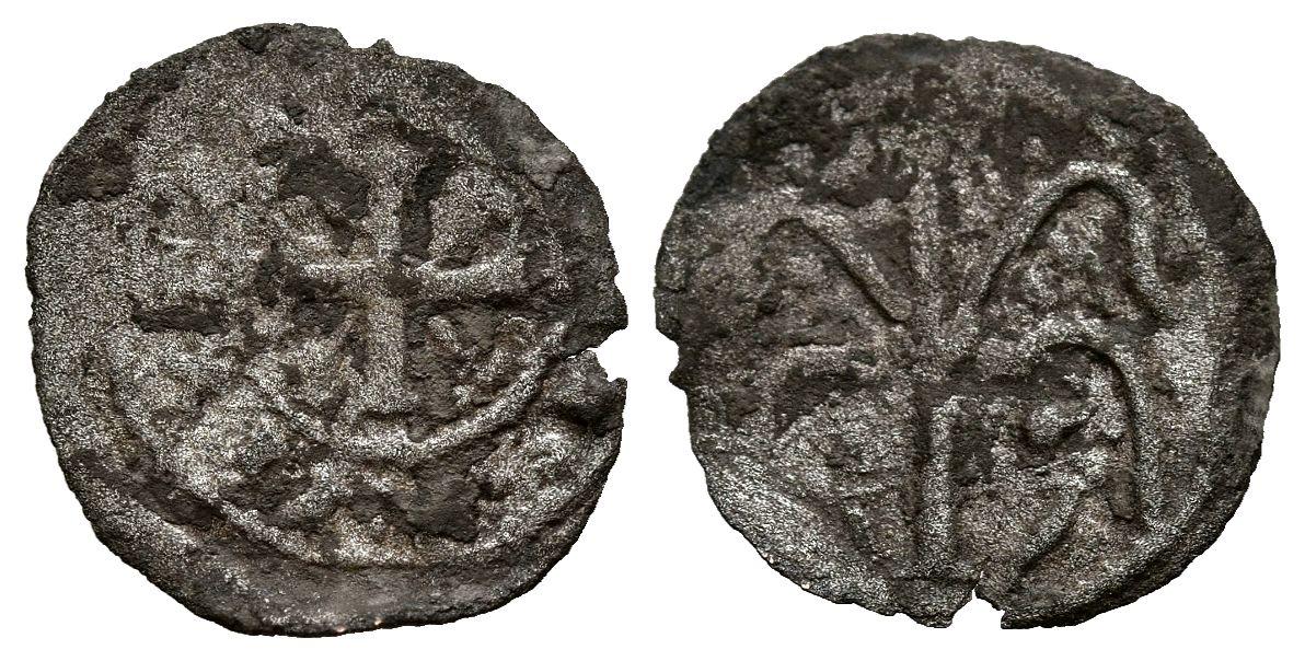 ALFONSO IX (1188-1230). Obolo. (Ve. 0,20g/12mm). Posiblemente León. (FAB-149.1). Anv: cruz patada con veros sobre vástagos en cuarteles, alrededor leyenda: ILDEFONS REX. Rev: Cruz sobre árbol y bajo sus ramas dos leones. MBC- Escasa.