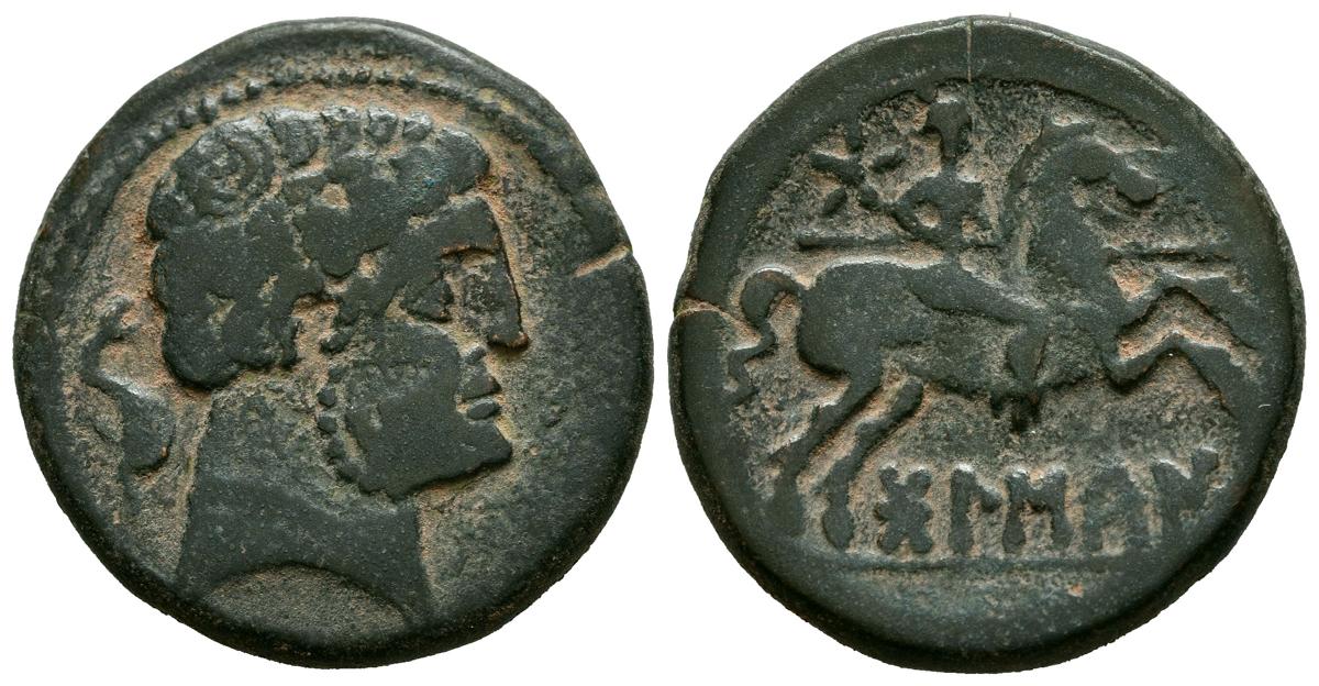 BOLSCAN (Huesca). As. (Ae. 9,29g/24mm). 180-20 a.C. (FAB-1918). Anv: Cabeza barbada masculina a derecha, detrás delfín. Rev: Jinete con lanza a derecha, encima estrella, debajo leyenda ibérica: BoLSCaN. MBC. Pátina verde.