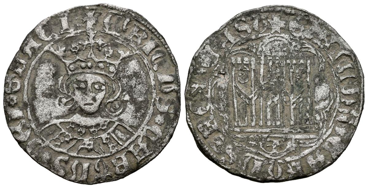 ENRIQUE IV (1454-1474). Cuartillo. (Ve. 3,06g/26mm). Toledo. (FAB-757). Anv: Busto coronado del rey de frente, dentro de gráfila circular, alrededor leyenda: ENRICVS QVARTVS DEI GRACIA REX. Rev: Castillo con T como marca de ceca debajo, todo dentro de grafila lobular, alrededor leyenda: ENRICVS REX CASTELLE E LE. MBC+. Vellón rico.