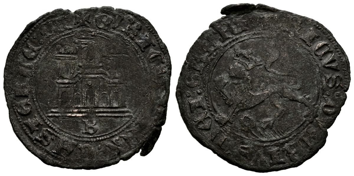 ENRIQUE IV (1454-1474). 1 Maravedí. (Ve. 2,45g/25mm). Burgos. (FAB-791). Anv: Castillo, debajo B como marca de ceca todo dentro de gráfila circular, alrededor leyenda: ENRICVS DEI GRACIA. Rev: León coronado y rampante a izquierda en gráfila circular, alrededor leyenda: ENRICVS CARTVS DEI GRA. MBC.