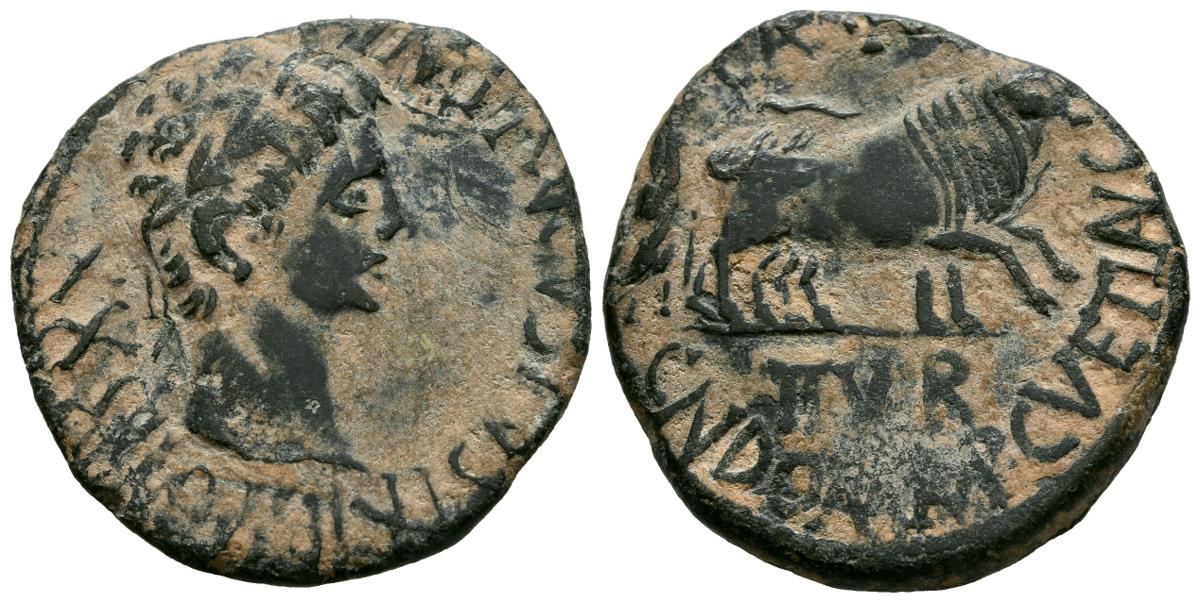 CAESARAUGUSTA (Zaragoza). As. (Ae. 9,44g/29mm). 27 a.C.-14 d.C. (FAB-327). Anv: Cabeza de Augusto laureada a derecha, alrededor leyenda: IMP AVGVSTVS TRIB POTES XX. Rev: Yunta a derecha, debajo: II VIR, alrededor leyenda: CAES AVGVS CN DOM AMP C VET LANC. MBC.