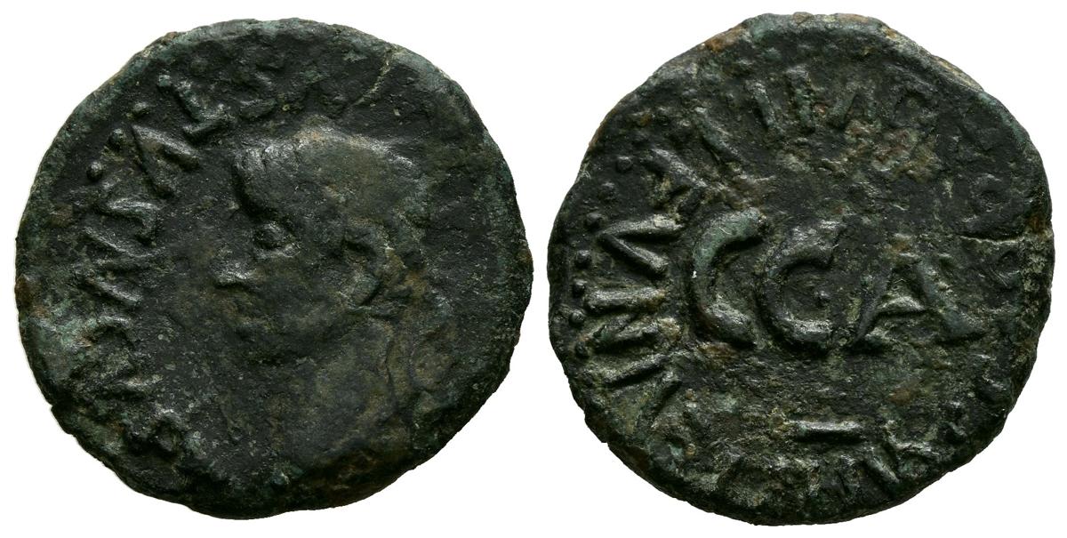 CAESARAUGUSTA (Zaragoza). Semis. (Ae. 4,54g/20mm). 14-36 a.C. (FAB-379). Anv: Cabeza laureada de Tiberio a izquierda, alrededor leyenda: TI CAESAR AVGVSTVS AVGVSTI F. Rev: CCA, alrededor leyenda: C CARR AQVIL L FVNI VET F II VIR. MBC. Escaso.
