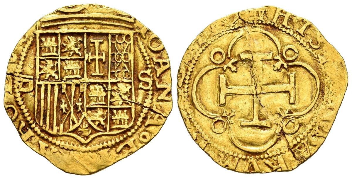 JUANA Y CARLOS (1504-1555). 1 Escudo. (Au. 3,36g/22mm). Sevilla. (Cal-2019-199). MBC+/MBC. Grieta. Escaso ejemplar.