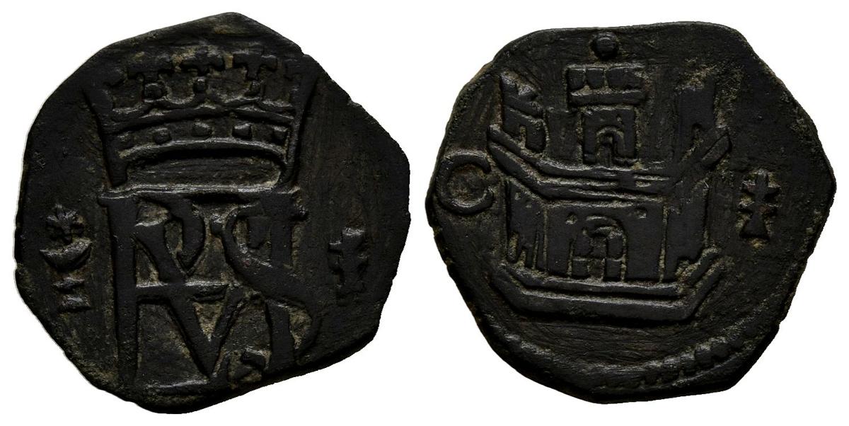 FELIPE II (1556-1598). Blanca (Ve. 0,99g/16mm). S/D (1566-1572). Cuenca. (Cal-2019-35). Punto sobre el castillo. MBC-. Símbolos y letras intercambiadas.