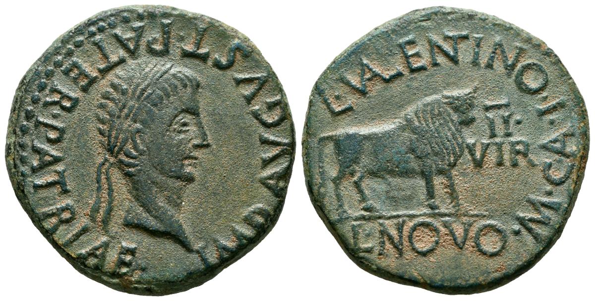 CALAGURRIS (Calahorra, La Rioja). As. (Ae. 13,32g/29mm). 27 a.C-14 D.C. (FAB-418). Anv: Cabeza laureada de Augusto a derecha, alrededor leyenda: IMP AVGVST PATER PATRIAE. Rev: Toro a derecha, delante: II/VIR, alrededor leyenda: L VALENTINO L NOVO M CAL I. EBC-. Pátina verde. Bonito ejemplar, escaso así.