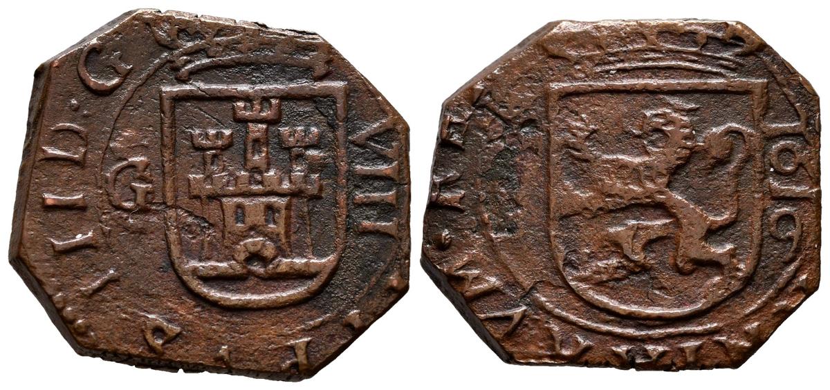 FELIPE III (1598-1621). 8 Maravedís (Ae. 5,92g/23mm). 1616. Granada. Considerada falsa de época. Granada no acuñó módulos ni de 4 ni de 8 maravedís en este reinado. MBC.