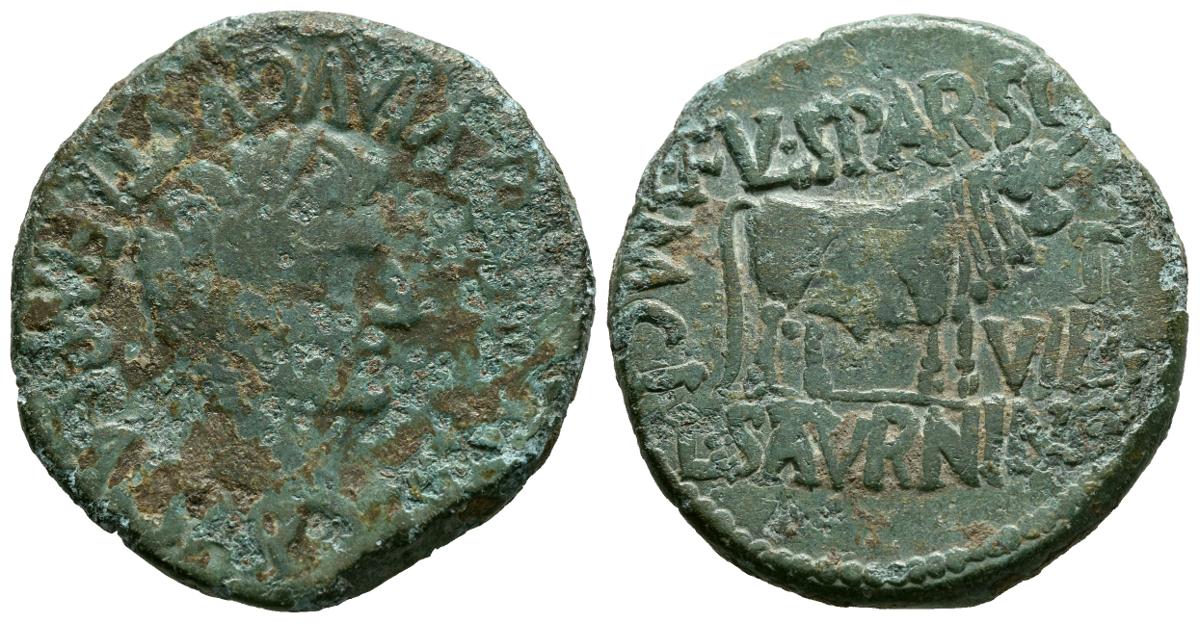 CALAGURRIS (Calahorra, La Rioja). As. (Ae. 10,81g/30mm). 14-36 d.C. (FAB-429). Anv: Cabeza laureada de Tiberio a derecha, alrededor leyenda: TI AVGVS DIVI AVGVSTI F IMP CAESAR. Rev: Toro a derecha, alrededor leyenda: L FVL SPARSO L SATVRNINO II VIR MCI. MBC-/MBC. Pátina verde.