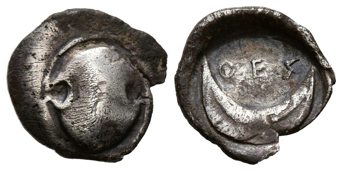 BOEOTIA, Thespiai. Obolo. (Ar. 0,78g/12mm). Siglo IV a.C. (BCD Boiotia 598; HGC 4, 1402). Anv: Anv: Escudo. Rev: Creciente, encima letras griegas. MBC.