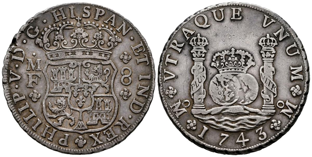 FELIPE V (1700-1746). 8 Reales. (Ar. 26,78g/38mm). 1743. México MF. (Cal-2019-1463). MBC+. Muesca en grafila del anverso. Bonito tono.