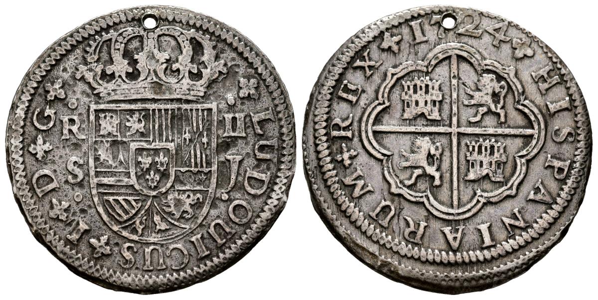 LUIS I (1724). 2 Reales. (Ar. 5,28g/28mm). 1724. Sevilla J. (Cal-2019-29). LUDOUICUS. EBC-. Pequeña perforación a las 12h. Aún así precioso y escaso ejemplar.