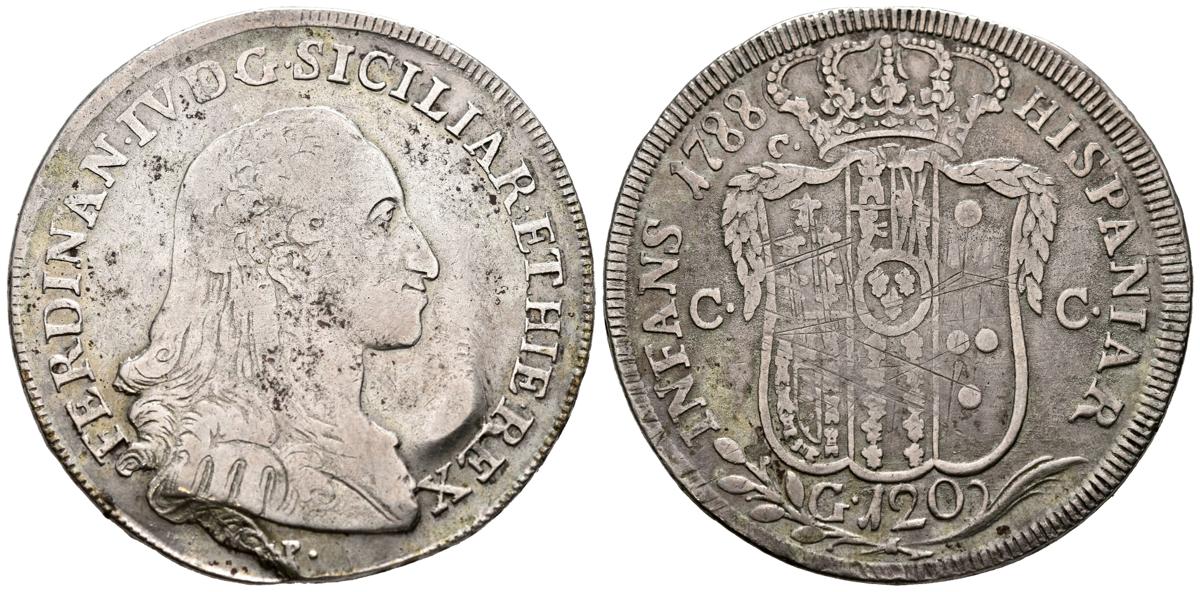 FERNANDO IV de Nápoles (Infante de España). 1 Piastra (120 Grana). (Ar. 26,88g/42mm). 1788. Nápoles. (Vicenti 286). MBC-. Rayas en reverso.