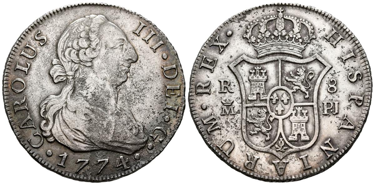 CARLOS III (1759-1788). 8 Reales. (Ar. 26,85g/39mm). 1774. Madrid PJ. (Cal-2019-1064). MBC+. Oxidaciones limpiadas. Bonito ejemplar.