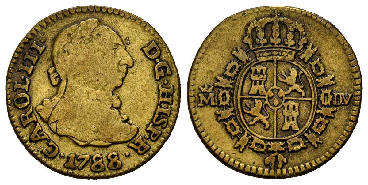 CARLOS III (1759-1788). 1/2 Escudo. (Metal Blanco sobredorado. 1,17g/15mm). 1788. Madrid DV. (Cal-2019-1284). Falsa de época. BC+/MBC-.