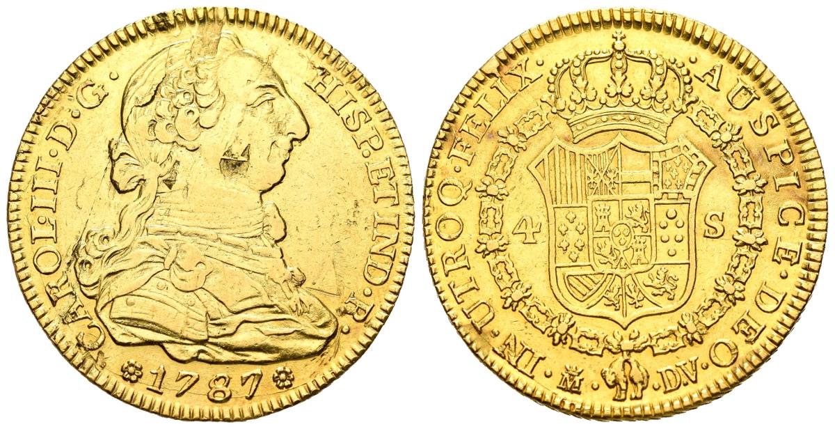 CARLOS III (1759-1788). 4 Escudos. (Au. 13,36g/29mm). 1787. Madrid DV. (Cal-2019-1793). MBC/MBC+. Hojas y erosiones en anverso. Limpiada.