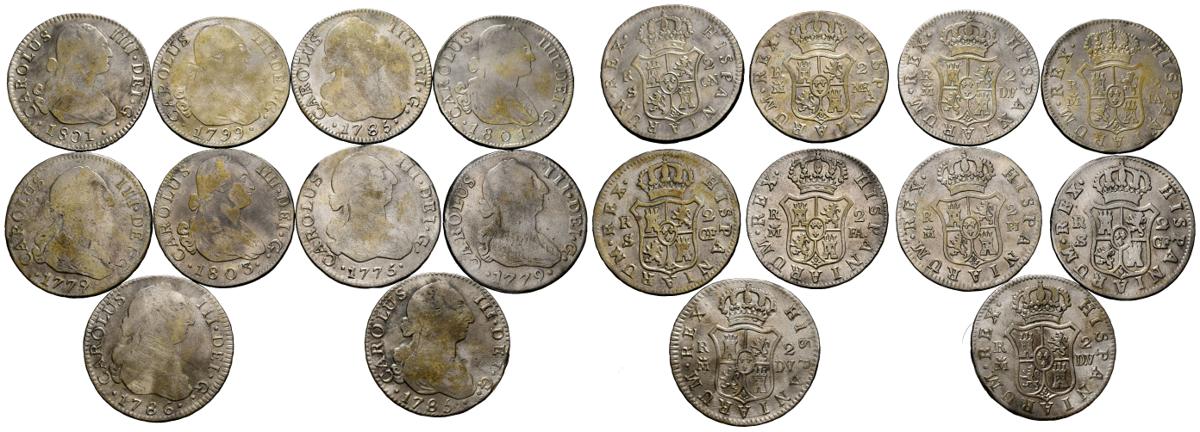 Conjunto de 10 monedas de 2 Reales de Carlos III y Carlos IV de distintos años y cecas. A EXAMINAR.