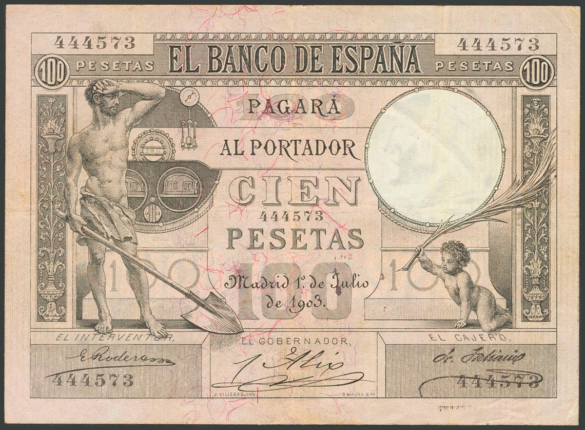 100 Pesetas. 1 de Julio de 1903. Sin serie. Leves defectos del papel. (Edifil 2017: 310). Rarísimo. MBC.