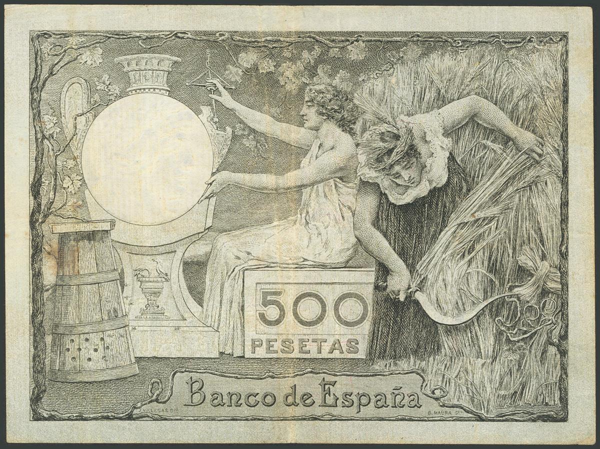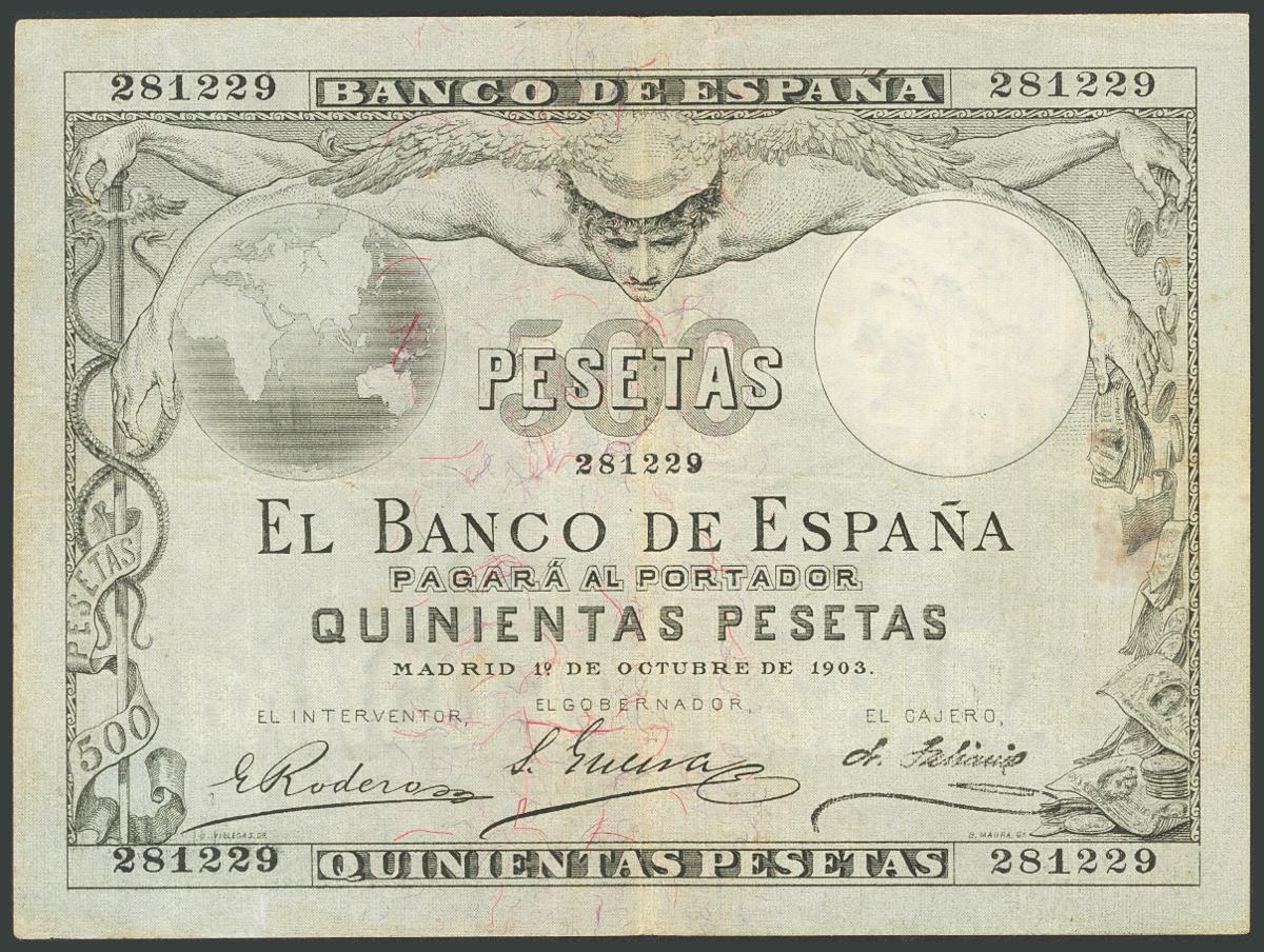 500 Pesetas. 1 de Octubre 1903. Sin serie. (Edifil 2017: 311). Pequeña reparación sin importancia. Extraordinariamente raro, sin duda el más raro de todo el siglo XX. MBC+.