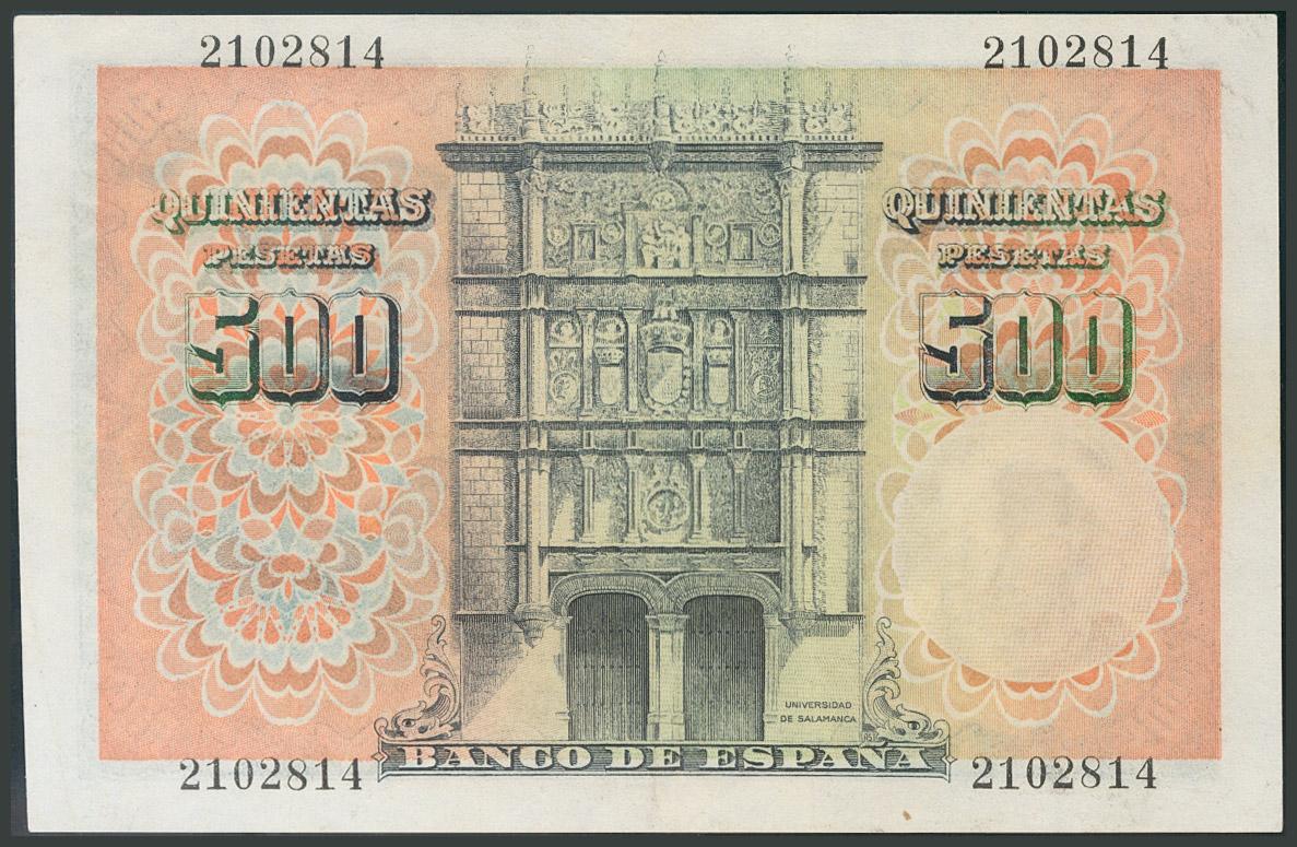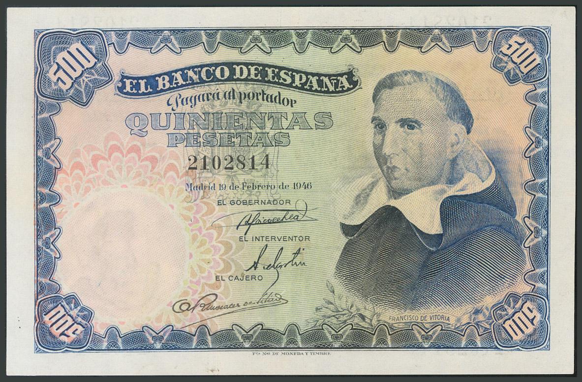 500 Pesetas. 19 de Febrero de 1946. Sin serie. (Edifil 2017: 452). Apresto original. Rarísimo. EBC.