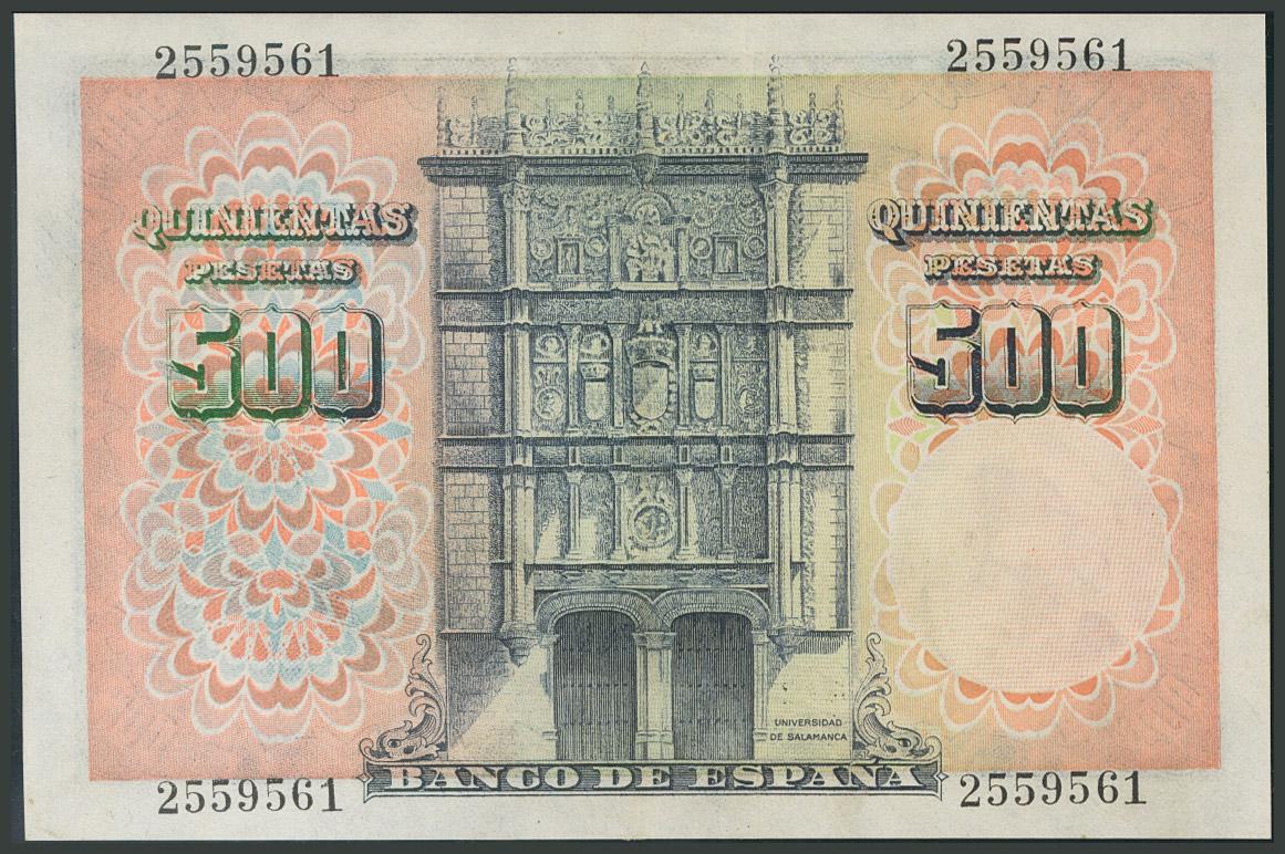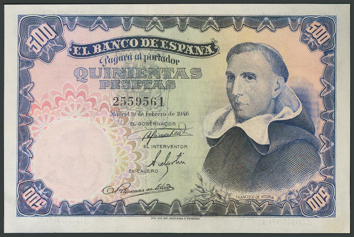 500 Pesetas. 19 de Febrero de 1946. Sin serie. Invisible ondulación central. (Edifil 2017: 452). Conserva todo su apresto. EBC+.