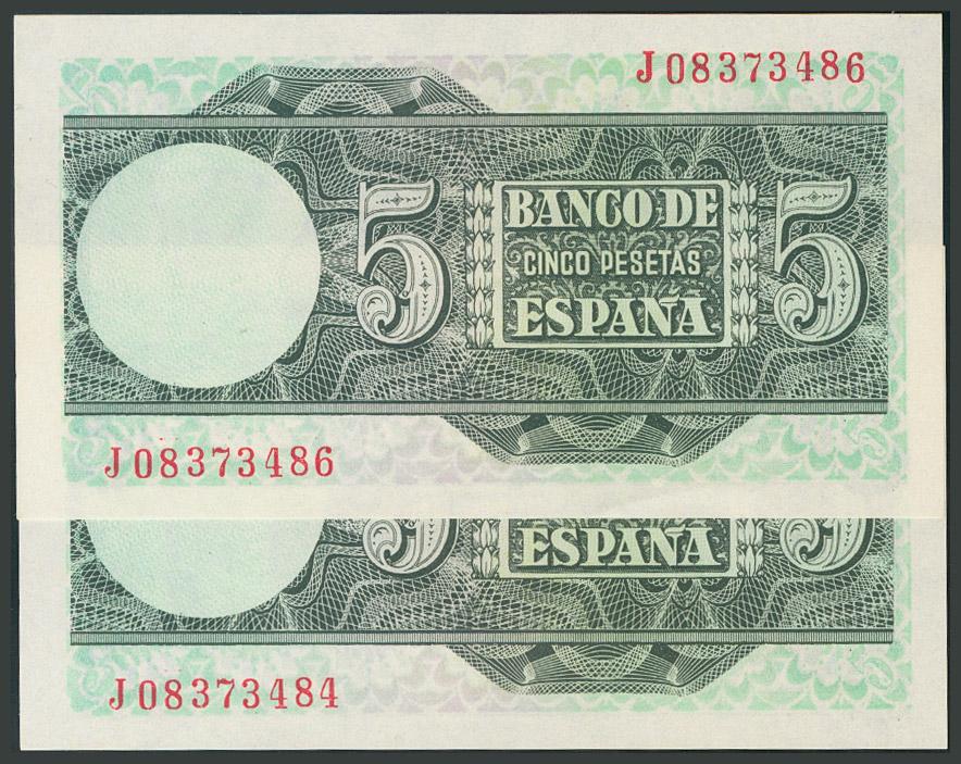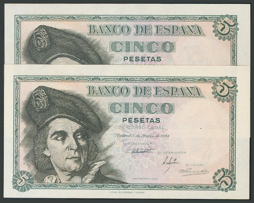 5 Pesetas. 5 de Marzo de 1948. Pareja casi correlativa. Serie J. (Edifil 2017: 455a). SC-.