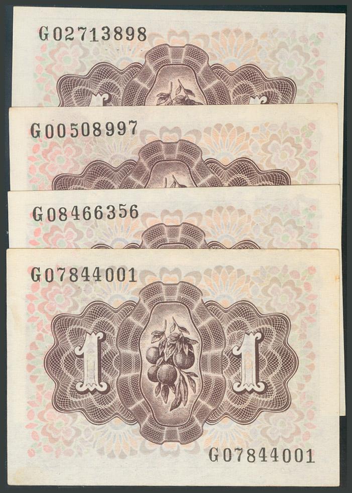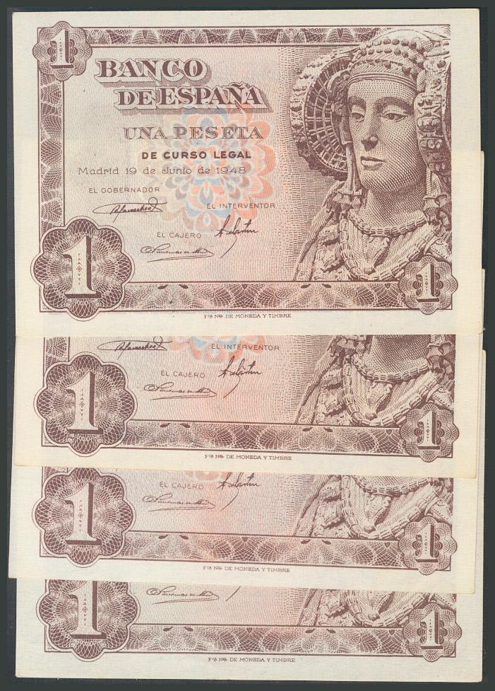 Conjunto de 4 billetes de 1 Peseta de la emisión de 19 de Junio de 1948. Serie G. (Edifil 2017: 457a). EBC/EBC-.
