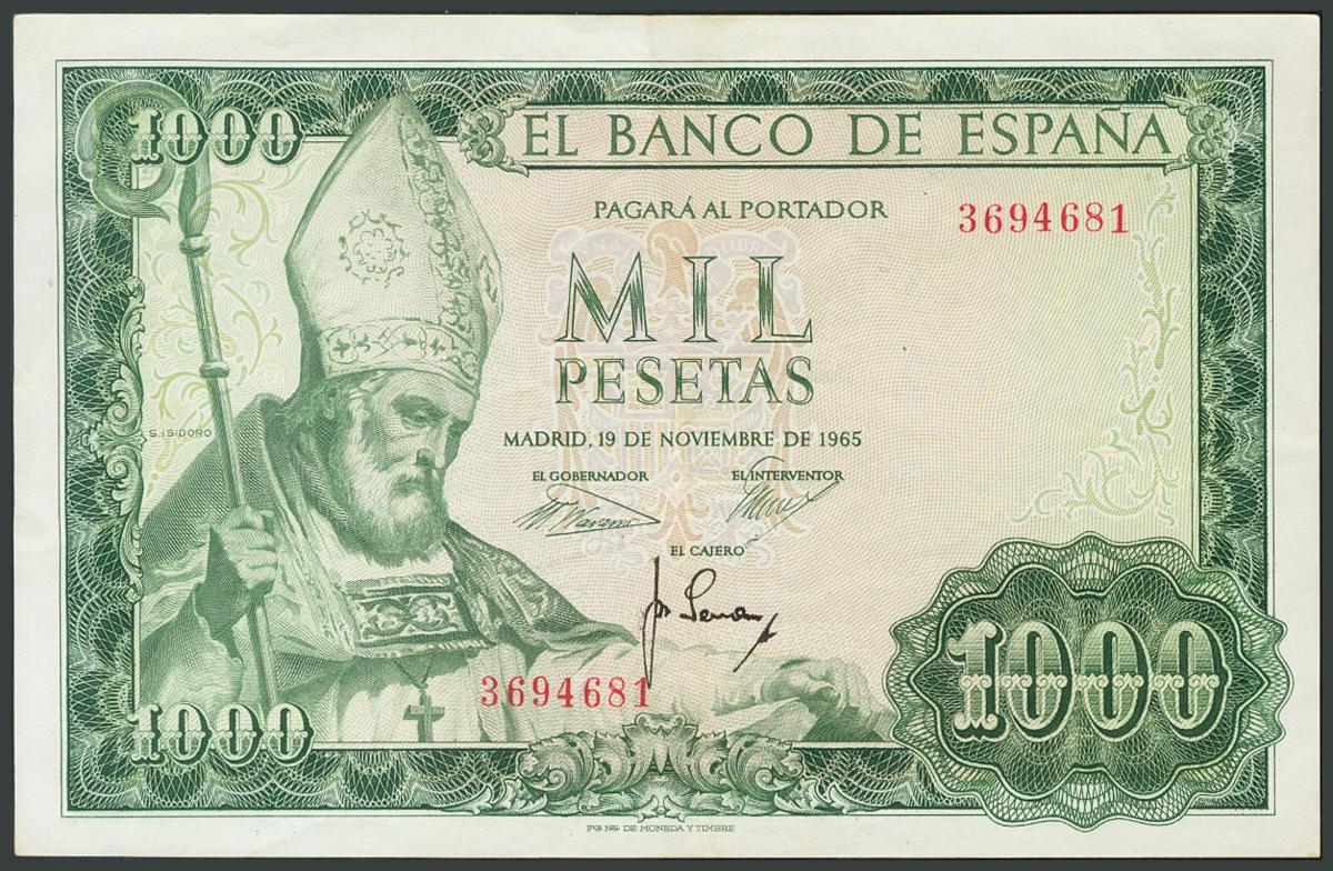 1000 Pesetas. 19 de Noviembre de 1965. Sin serie. Doblez vertical. (Edifil 2017: 471). Apresto original. EBC.