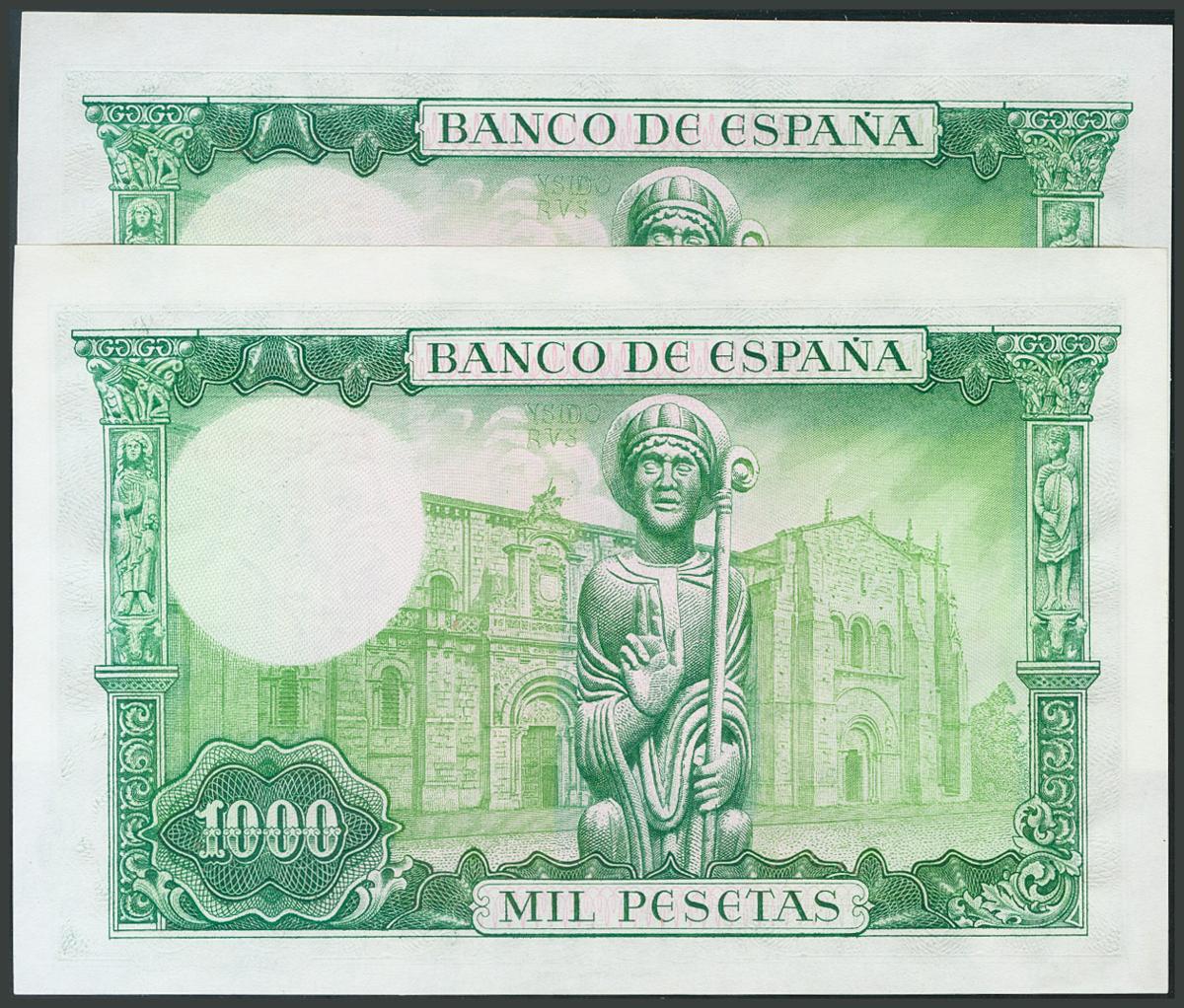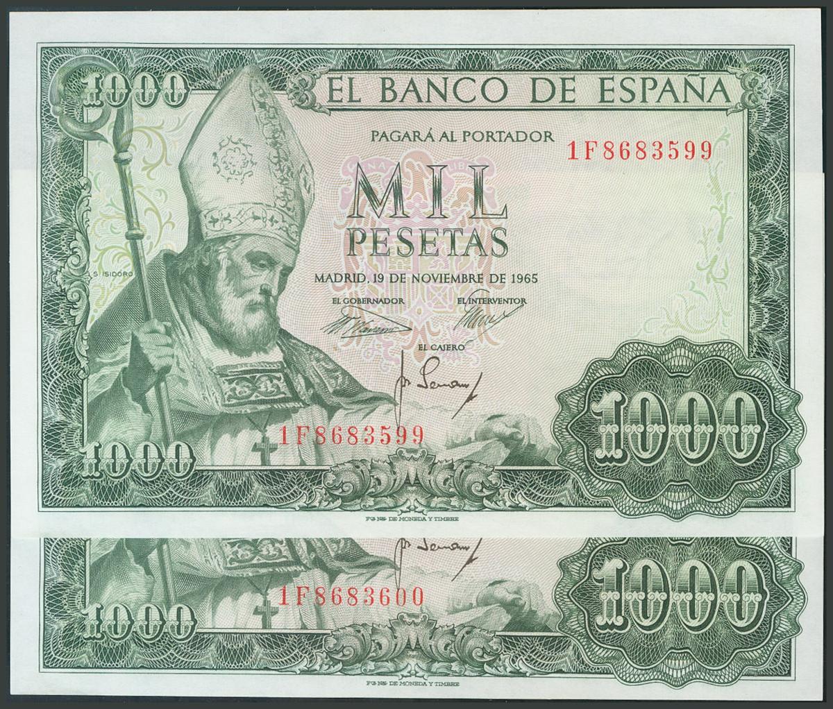1000 Pesetas. 19 de Noviembre de 1965. Pareja correlativa. Serie 1F. (Edifil 2017: 471b). SC.