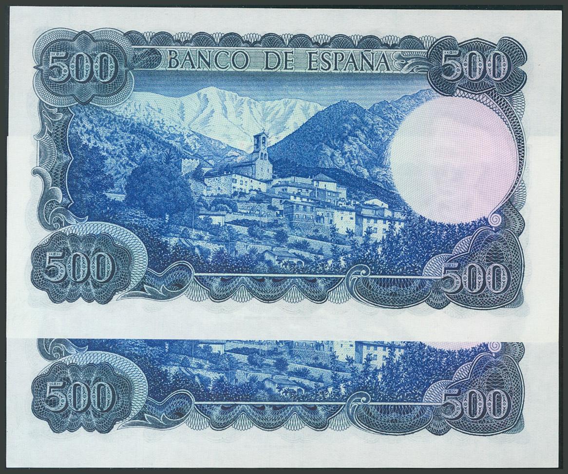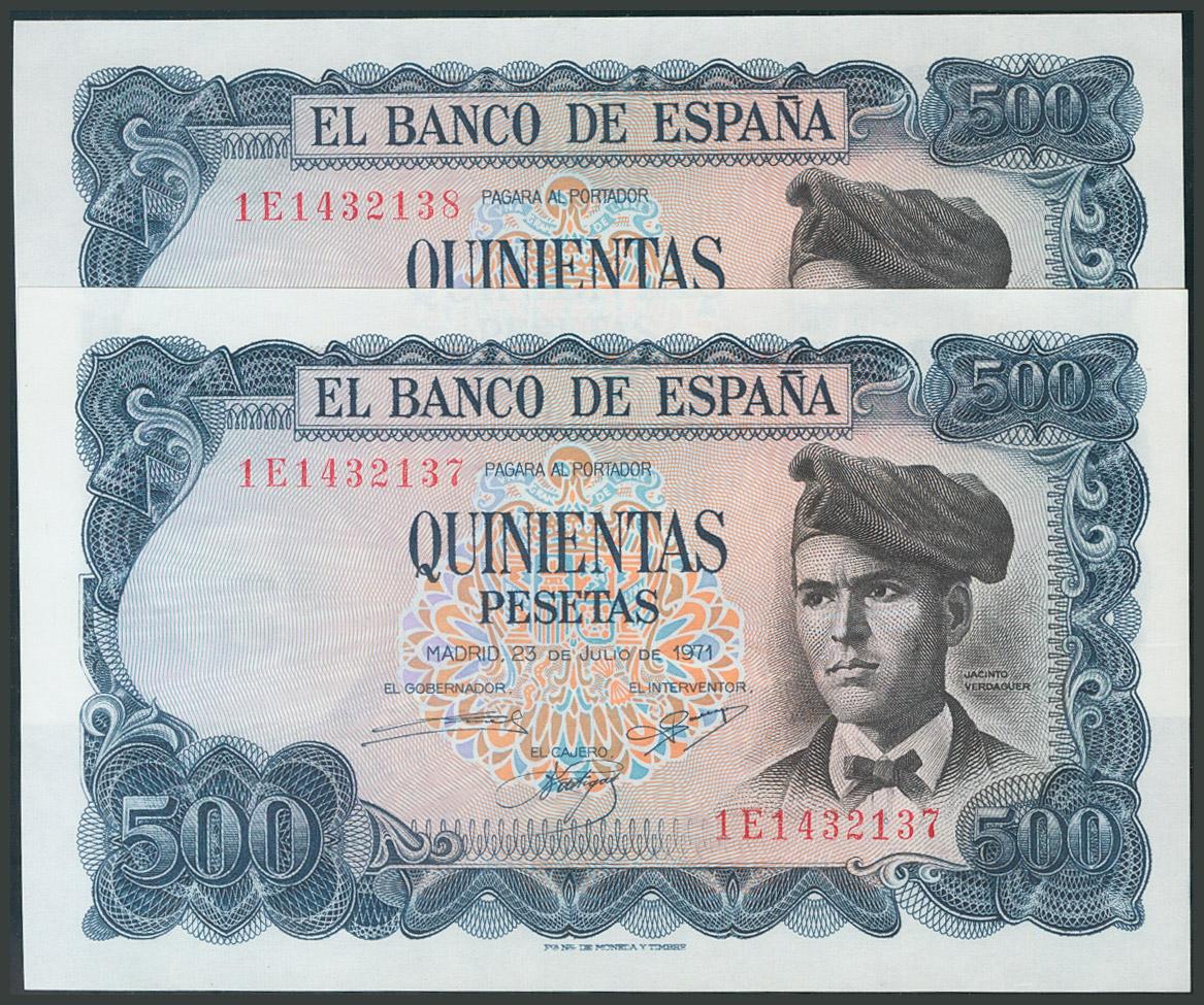 500 Pesetas. 23 de Julio de 1971. Pareja correlativa. Serie 1E. (Edifil 2017: 473a). Apresto original. SC.