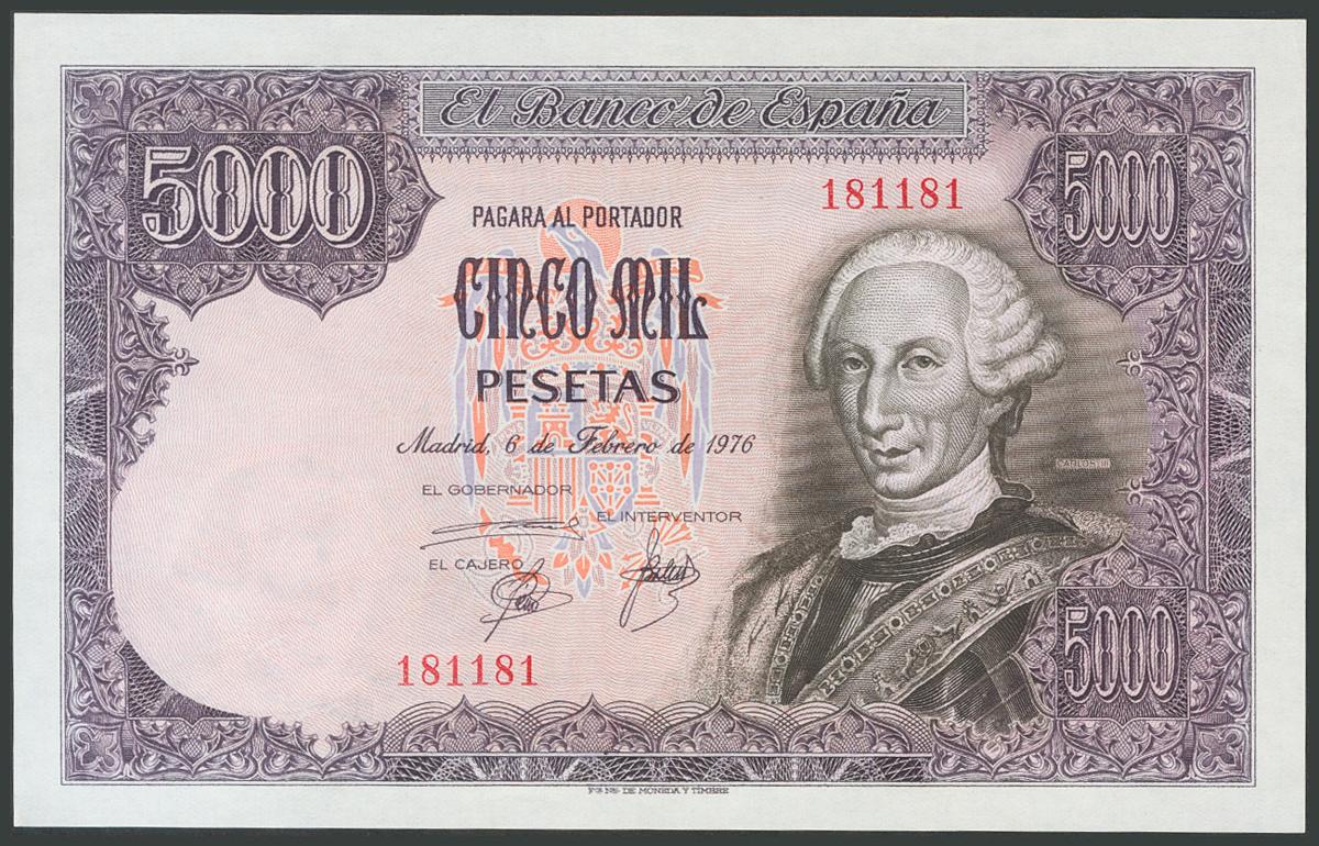 5000 Pesetas. 6 de Febrero de 1976. Capicúa. Sin serie. (Edifil 2017: 475). Apresto original. Raro. SC-.