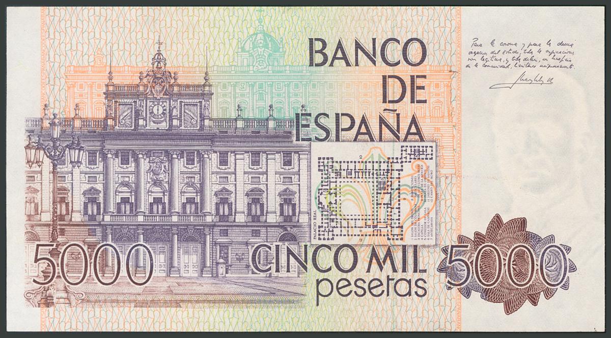 5000 Pesetas. 23 de Octubre de 1979. Variedad falta la impresión del color violeta en el anverso. Serie 7W. (Edifil 2017: 478a). EBC.