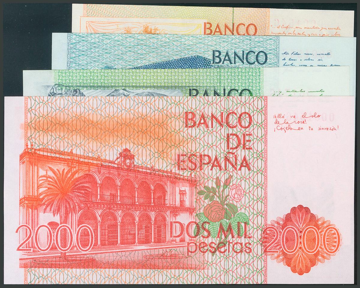 Conjunto de los billetes de 200, 500, 1000 y 2000 Pesetas emitidos entre el 23 de Octubre de 1979 y el 22 de Julio de 1980, todos ellos con la misma numeración 0001546. Raro conjunto. SC.