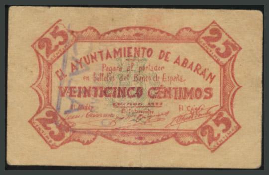 AYUNTAMIENTO DE ABARAN (MURCIA). 25 Céntimos. 1937. Marca de la caja del ayuntamiento al dorso. Montaner Nº 3-I; R. González Nº 16. BC.