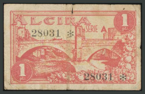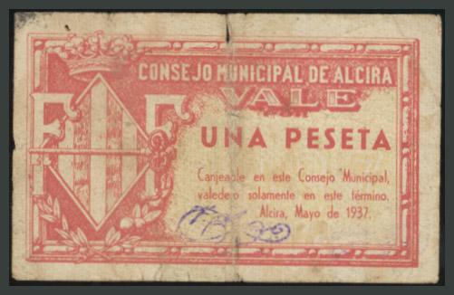 CONSEJO MUNICIPAL DE ALCIRA (VALENCIA). 1 Peseta. 1937. Rara variedad con una sóla firma. (Montaner: 80-C, González: 326). BC-. Escaso.