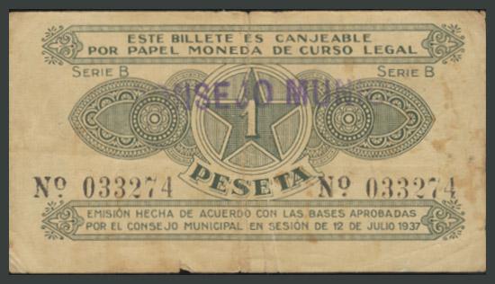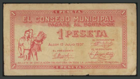 CONSEJO MUNICIPAL DE ALCOY (ALICANTE). 1 Peseta. Marca del Consejo Municipal al dorso. (Montaner: 91-B, González: 380). BC.