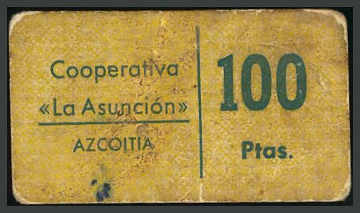 AZCOITIA (GUIPUZCOA). Postguerra. 100 Pesetas. Cooperativa "La Asunción". Marca del mercado al dorso. MBC-.