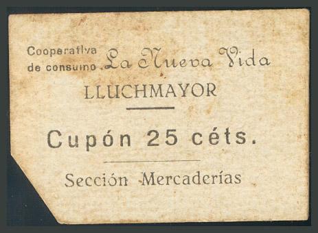 LLUCHMAYOR (MALLORCA). 25 Céntimos. Cooperativa de consumo "La Nueva Vida". Sección Mercaderías. Manchitas. MBC+.