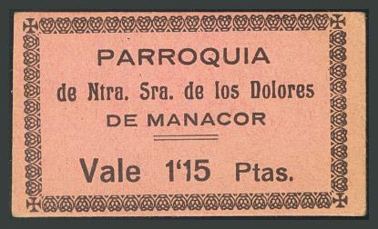 MANACOR (MALLORCA). 1,15 Pesetas. Parroquia de Ntra. Sra. de los Dolores. (Turró: no cita, Gónzalez: no cita). EBC+. Raro.
