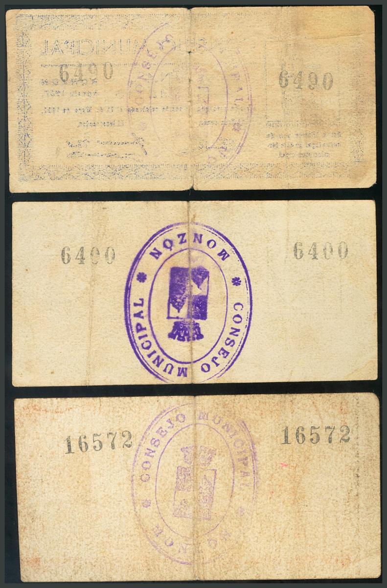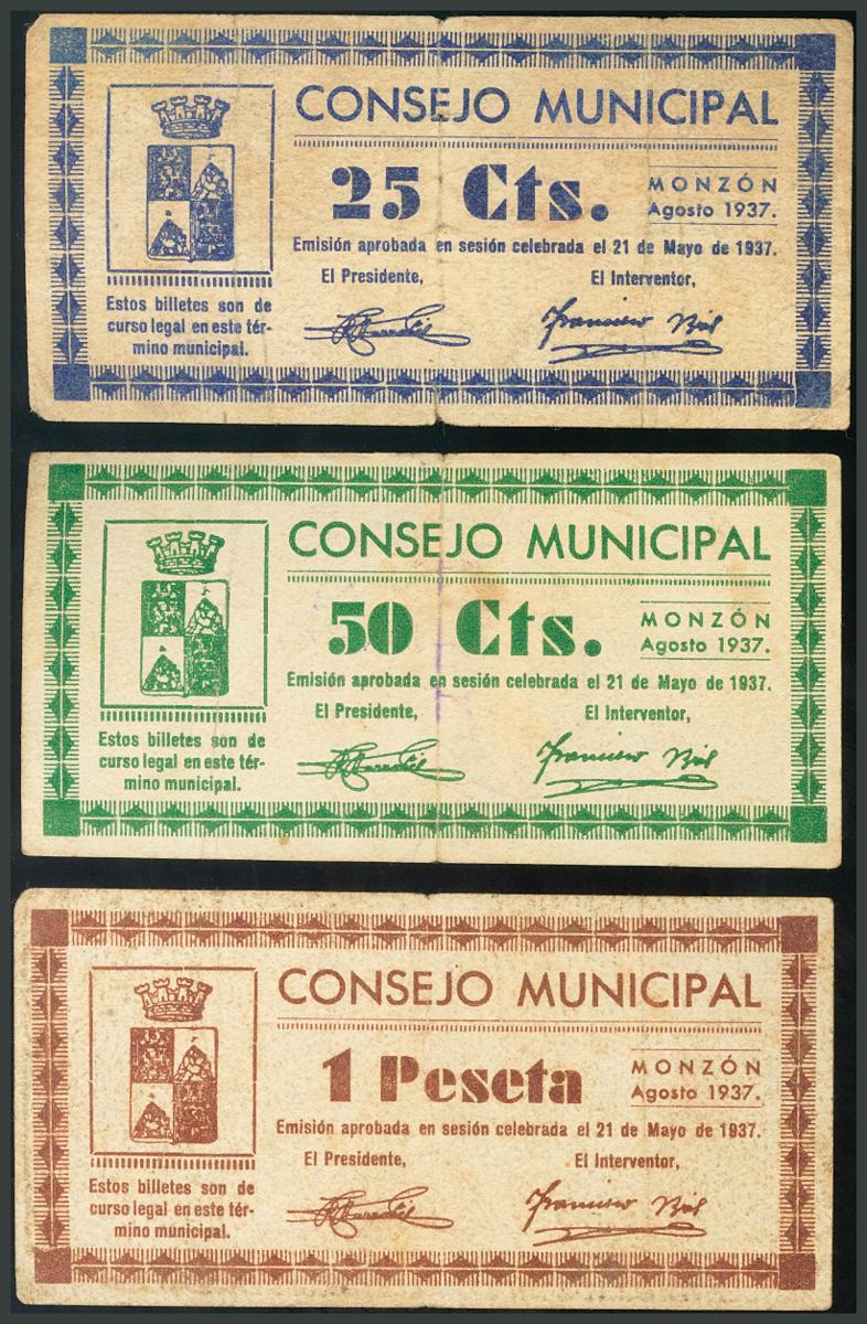 CONSEJO MUNICIPAL DE MONZON (HUESCA). Serie completa de 25-50 Céntimos y 1 Peseta. Marca del ayuntamiento al dorso. (Montaner: 967-D/E/F, González: 3677-3678-3679). BC-/BC.