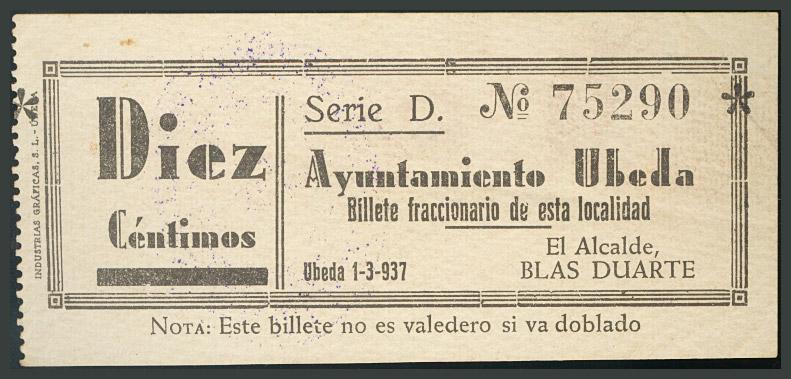 AYUNTAMIENTO DE UBEDA. 10 Céntimos. 1937. Marca del Ayuntamiento al dorso. (Montaner: 1487-A, González: 5197 mismo ejemplar). EBC.