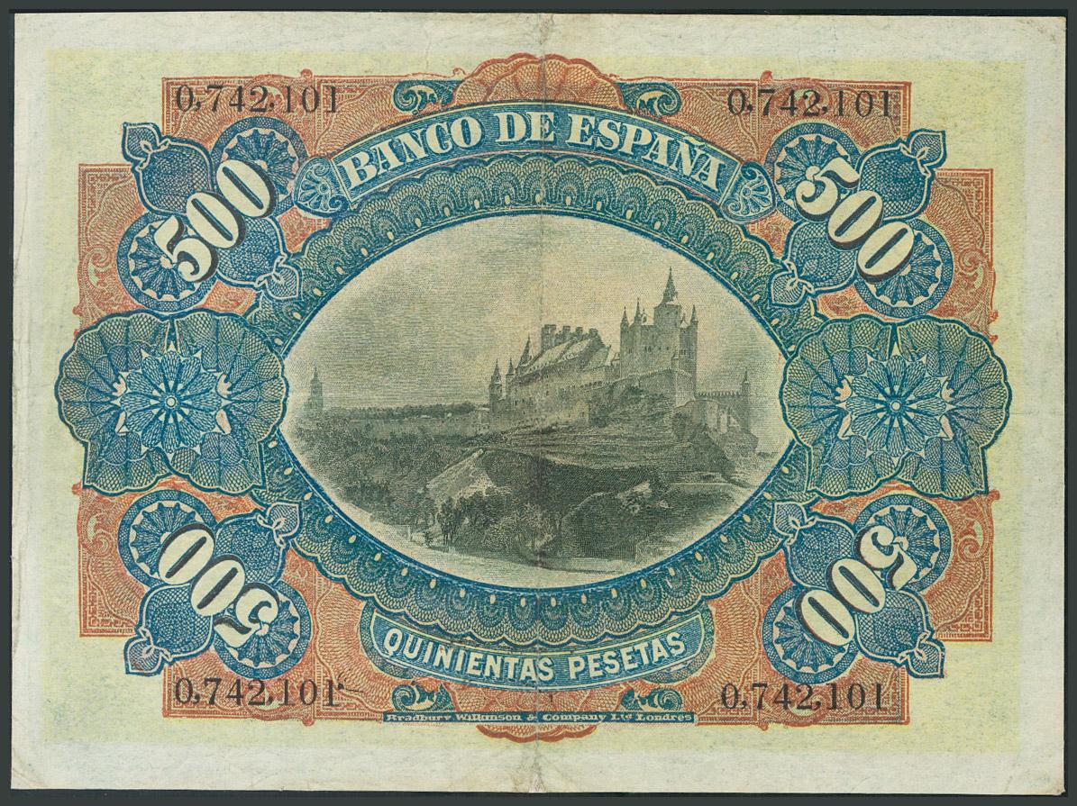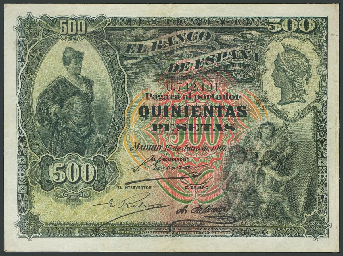 500 Pesetas. 15 de Julio de 1907. Sin serie. Leve reparación. (Edifil 2017: 321). MBC.