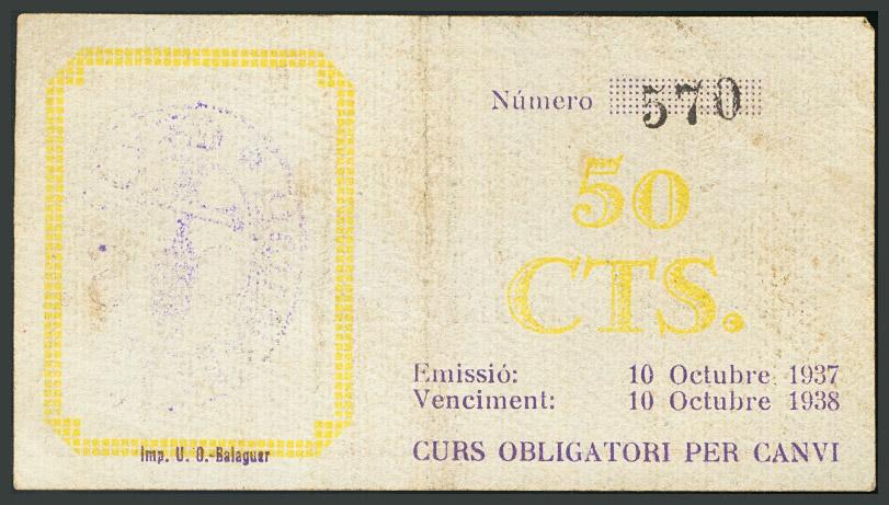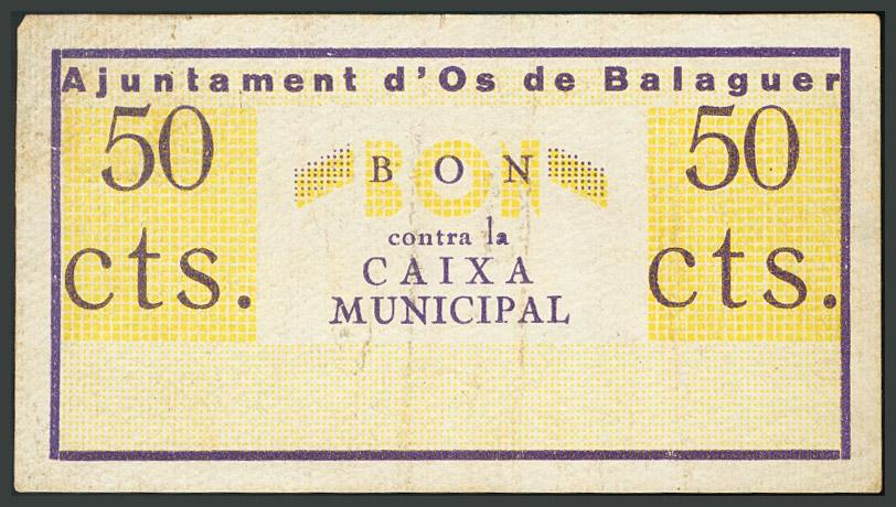 AJUNTAMENT D´OS DE BALAGUER (LLEIDA). 50 Céntimos. 1937. Marca del ayuntamiento al dorso. (Montaner no cita). MBC-. Raro.
