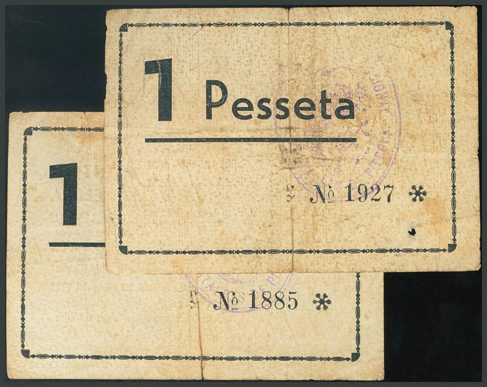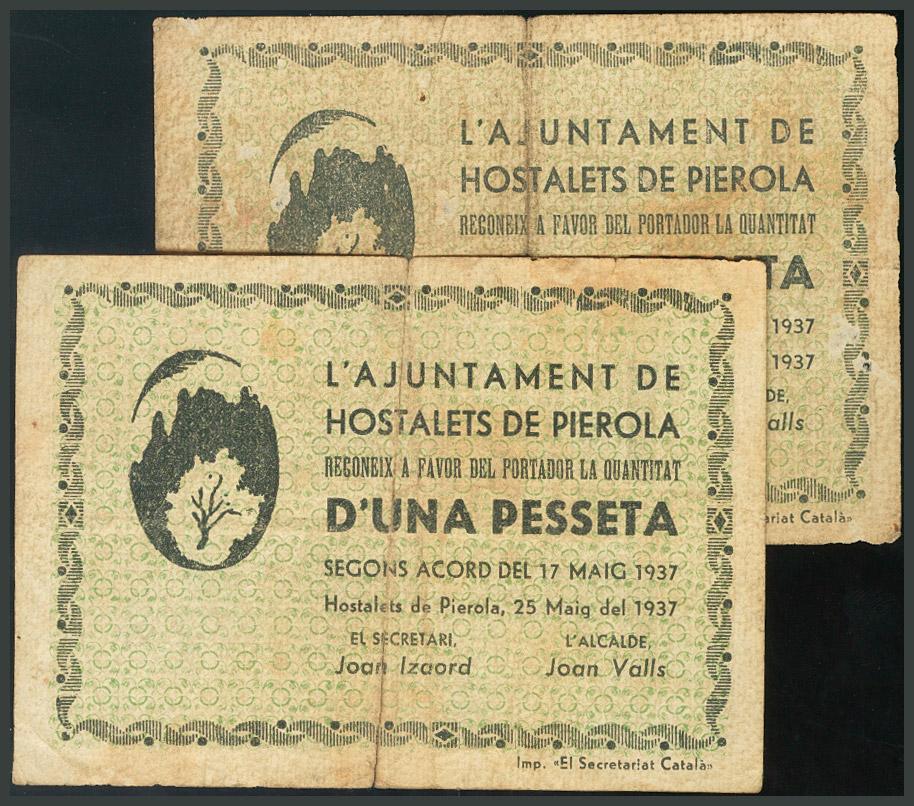 AJUNTAMENT DE HOSTALETS DE PIEROLA. (BARCELONA). 1 Peseta (2). 1937. Marca del Ayuntamiento al dorso. (Montaner: 768C). BC-/MC. Escasos.
