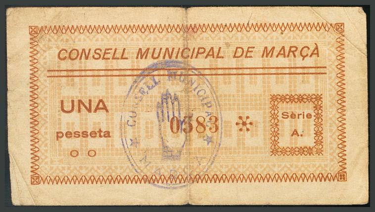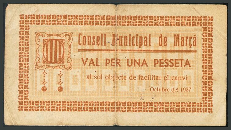 CONSELL MUNICIPAL DE MARÇA (TARRAGONA). 1 Peseta. Marca del ayuntamiento al dorso. (Montaner: 882-E). BC-.