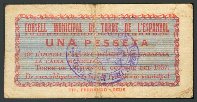 CONSELL MUNICIPAL DE TORRE L´ESPANYOL (TARRAGONA). 1 Peseta. Marca del ayuntamiento en anverso. (Montaner: 1446-G). BC.