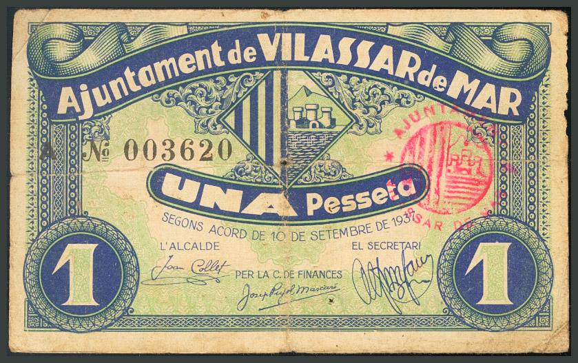 AJUNTAMENT DE VILASSAR DE MAR (BARCELONA). 1 Peseta. Marca del ayuntamiento en anverso. (Montaner: 1586-D). BC-.