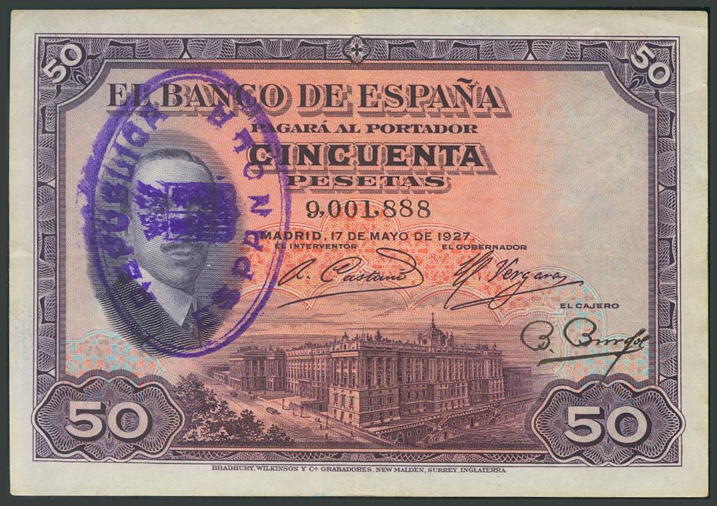 50 Pesetas. 17 de Mayo de 1927. Estampado con sello de caucho "República Española". Sin serie. (Edifil 2017: 332). EBC.