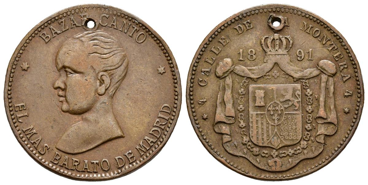 BAZAR CANTO. 1891. El más barato de Madrid. Calle de la Montera 4. Ae. 4,58g. Perforación. MBC+.