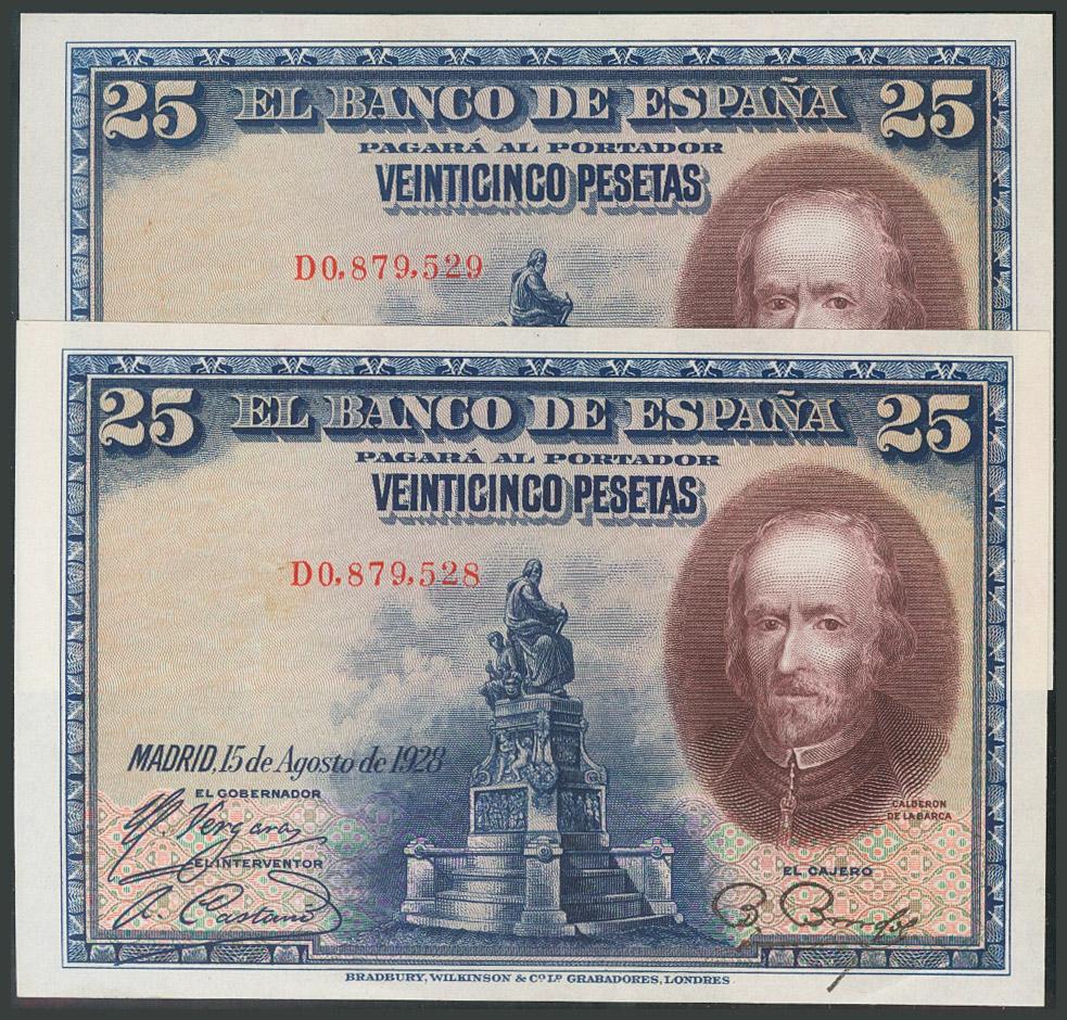 25 Pesetas. 15 de Agosto de 1928. Pareja correlativa. Serie D. Invisible ondulación. (Edifil 2017: 353). Apresto original. EBC+.