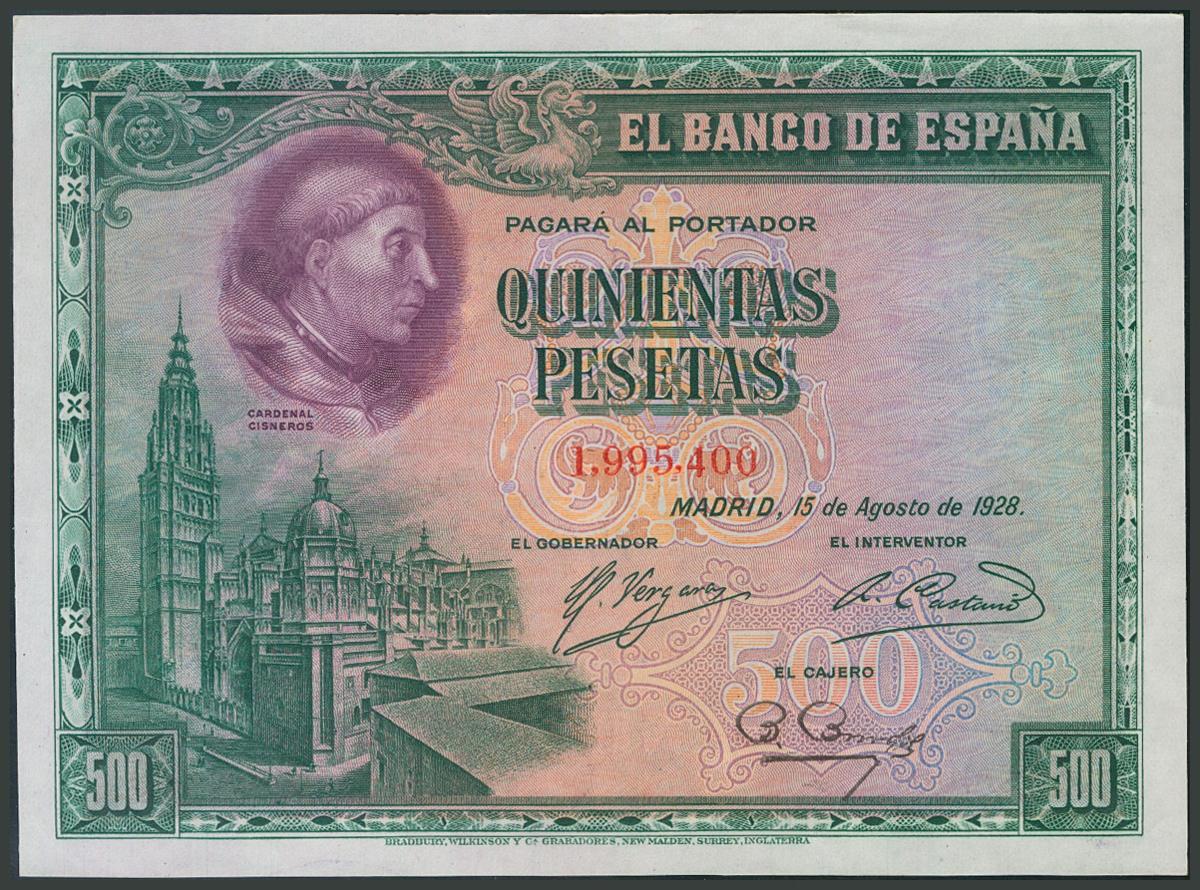 500 Pesetas. 15 de Agosto de 1928. Sin serie. (Edifil 2017: 356). SC.