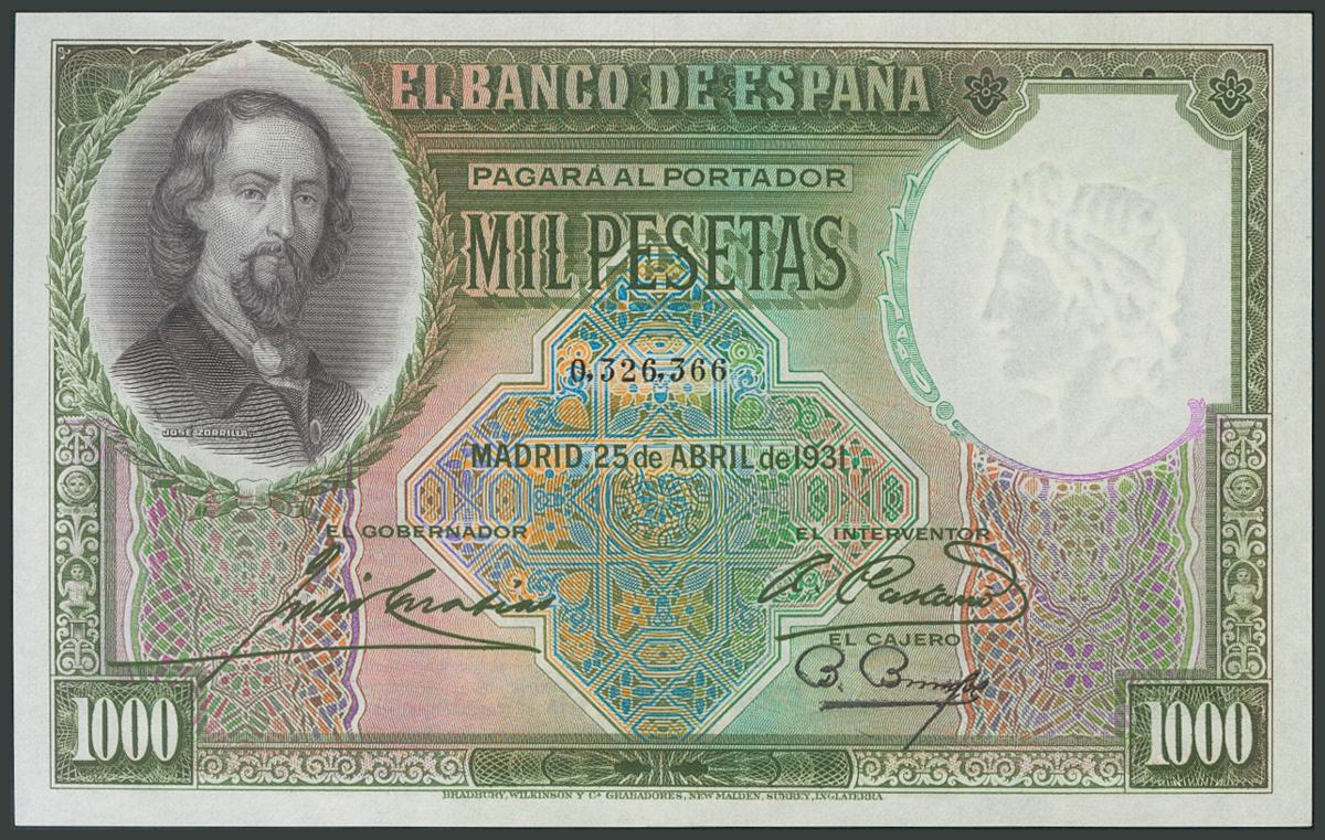 1000 Pesetas. 25 de Abril de 1931. Sin serie. (Edifil 2017: 362). Conserva su apresto original. Raro. SC.